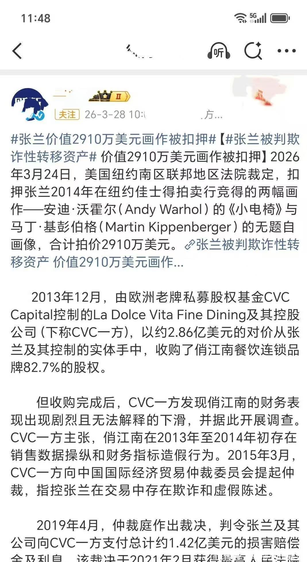 2026年3月27日,财新网等多家媒体披露了一份来自美国纽约州法院的裁决文件。 文件显示,法院批准了债权人CVC Capital Partners的申请,对张兰名下两幅艺术品进行了扣押。 这两幅画是张兰在2014年通过拍卖行购得的,当时花费了巨资。 法院文件指出,这两幅画目前的市场估值约为2910万美元,相当于人民币2亿元左右。