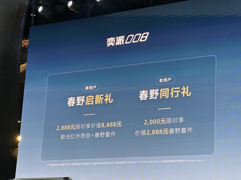 3月14日,东风奕派eπ008新增极光红车色和春野套件,限时售价2888元,套件包括车顶横拉杆、固定侧踏板和放电排插,同时,后续通过OTA升级,还将新增爆胎稳行系统(全系标配)和全新车载App。此外,新车还提供至高10000元购置税补贴、7年超低息、增换购至高补贴15000元等购车优惠。